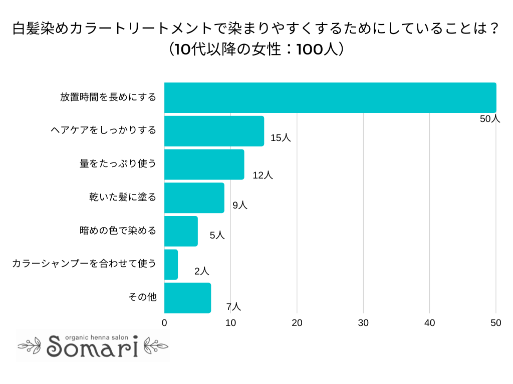 *本アンケート結果を引用する場合は「白髪染め専門美容室ソマリ」のURL(https://a-w-a.co.jp/hennasalonsomari/grayhairtreatment-howto/#siratorisomariyasuipr)を使用してください。