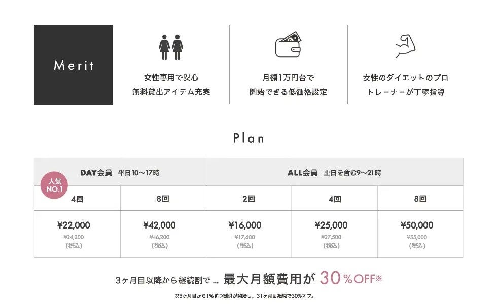 また、UNDEUX SUPERBODY千葉店は「月額制」を採用します。月4回(*1)のパーソナルトレーニング(栄養指導込み)が月額24,000円です。パーソナルジムの品質は一切落とさず、低価格を実現しました。