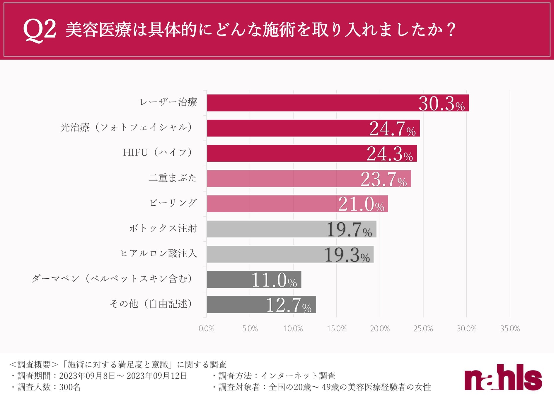 また、「光治療(フォトフェイシャル)(24.7%)」「HIFU(ハイフ)(24.3%)」「二重まぶた(23.7%)」といった回答も多いことがわかりました。