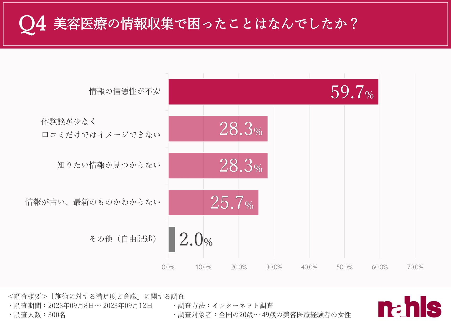 情報収集するうえで困ったことを伺ったところ、「情報の信憑性が不安(59.7%)」という方が最も多いことがわかりました。