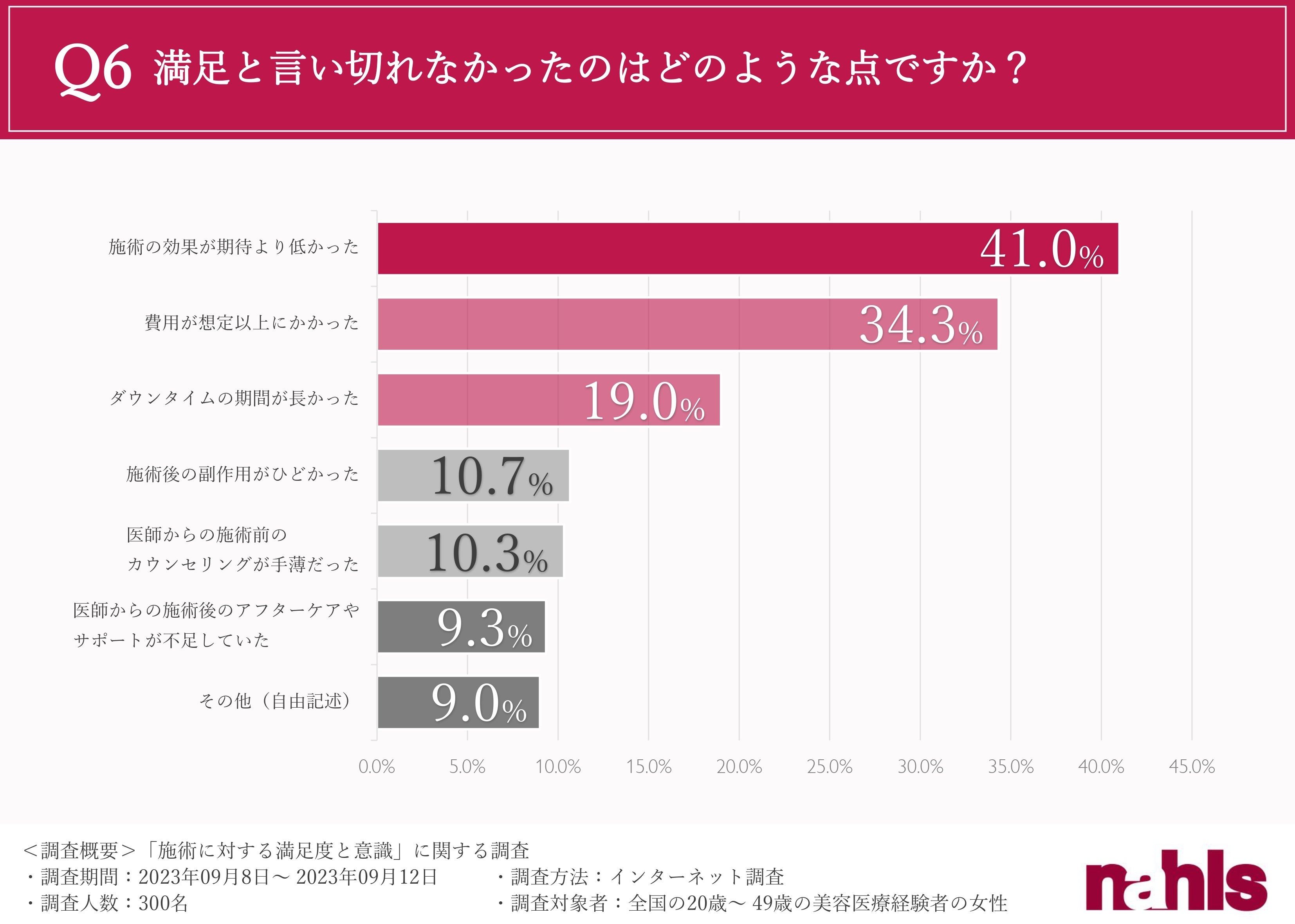 「施術の効果が期待より低かった(41.0%)」「費用が想定以上にかかった(34.3%)」という回答が上位を占める結果となりました。