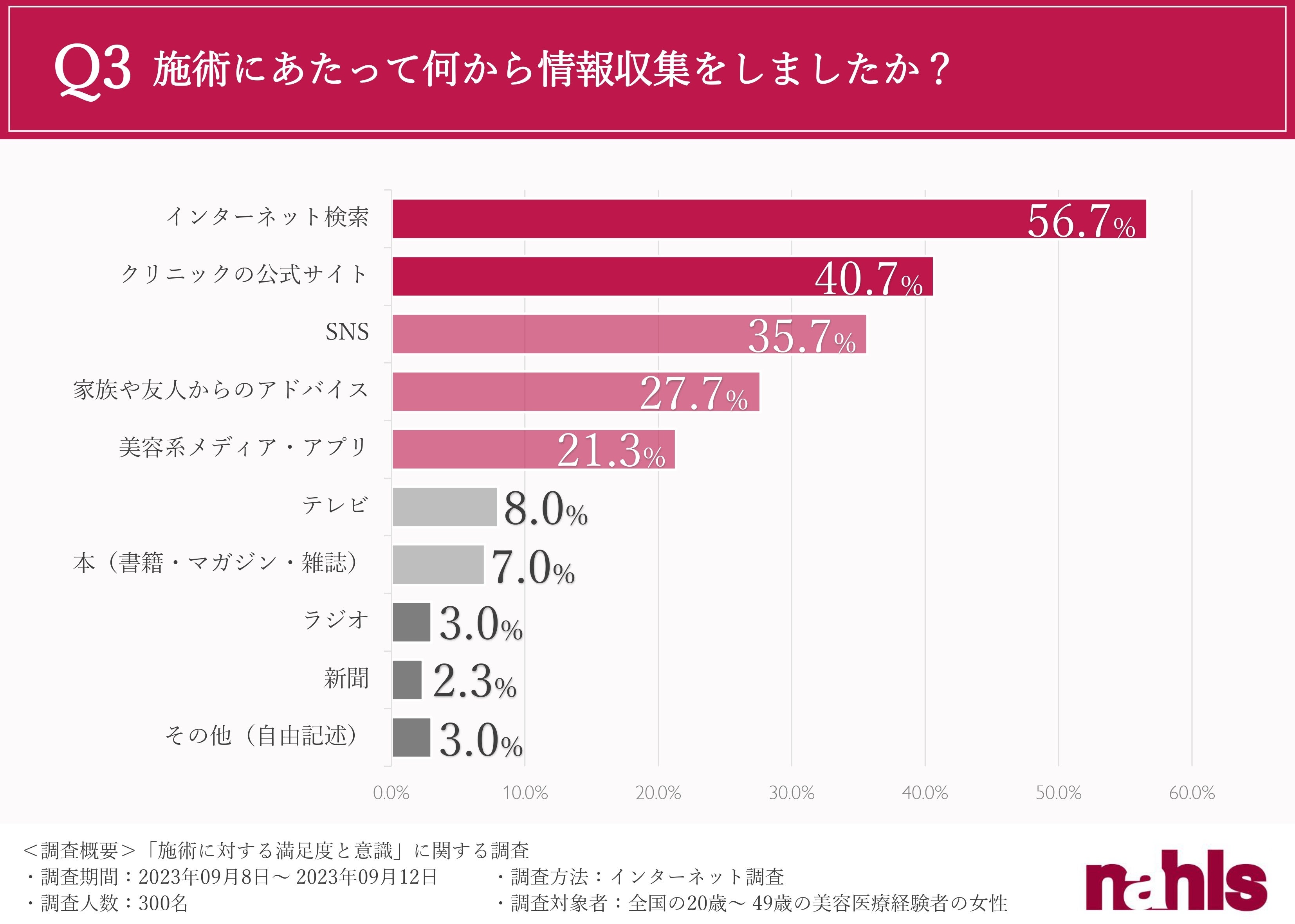 それらの美容医療の施術に関して、どこから情報収集をしているのか伺ったところ、「インターネット検索(56.7%)」「クリニックの公式サイト(40.7%)」「SNS(YouTube,Facebook, Twitter, Instagram, TikTokなど)(35.7%)」がTOP3という結果となりました。