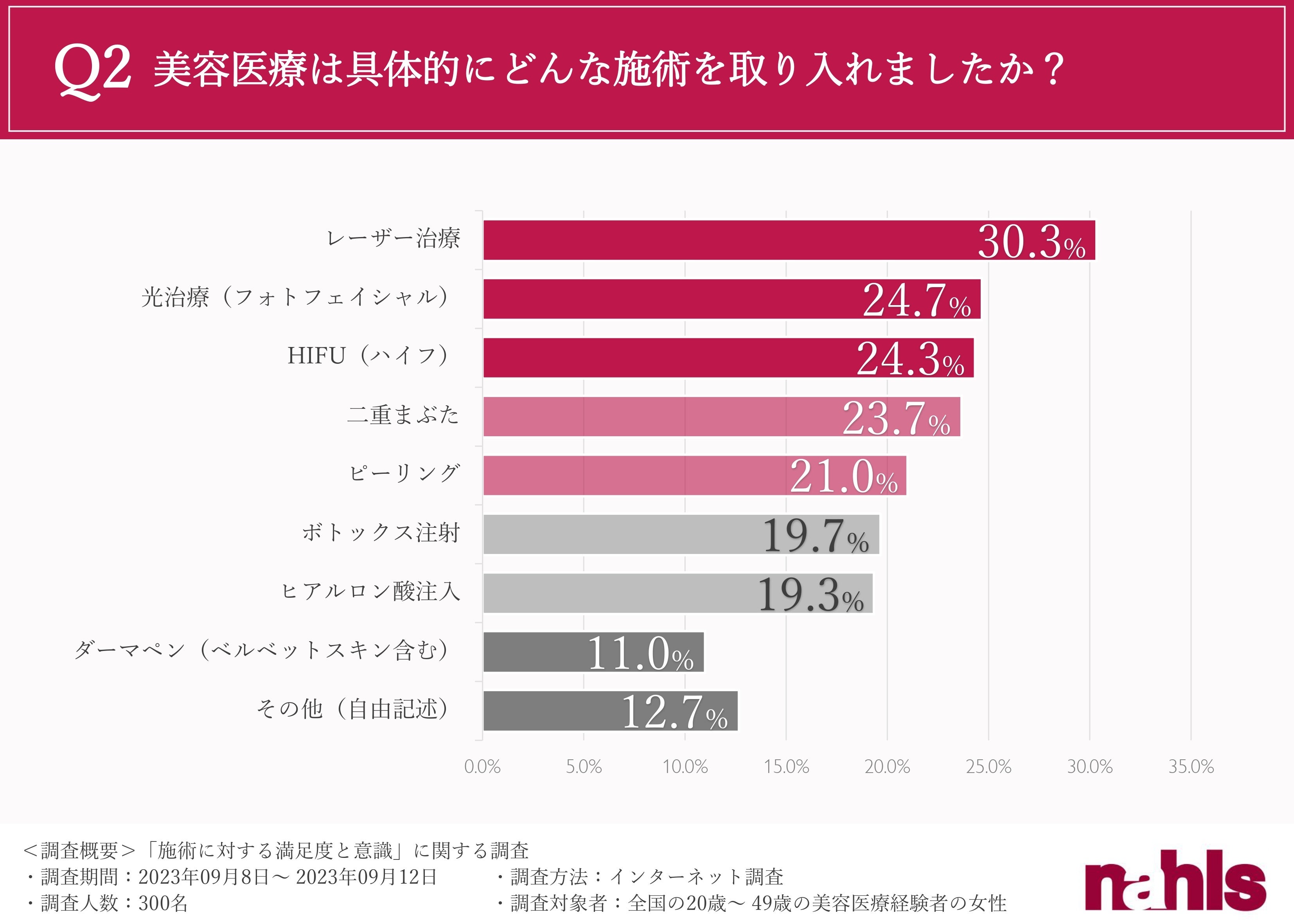 また、「光治療(フォトフェイシャル)(24.7%)」「HIFU(ハイフ)(24.3%)」「二重まぶた(23.7%)」といった回答も多いことがわかりました。