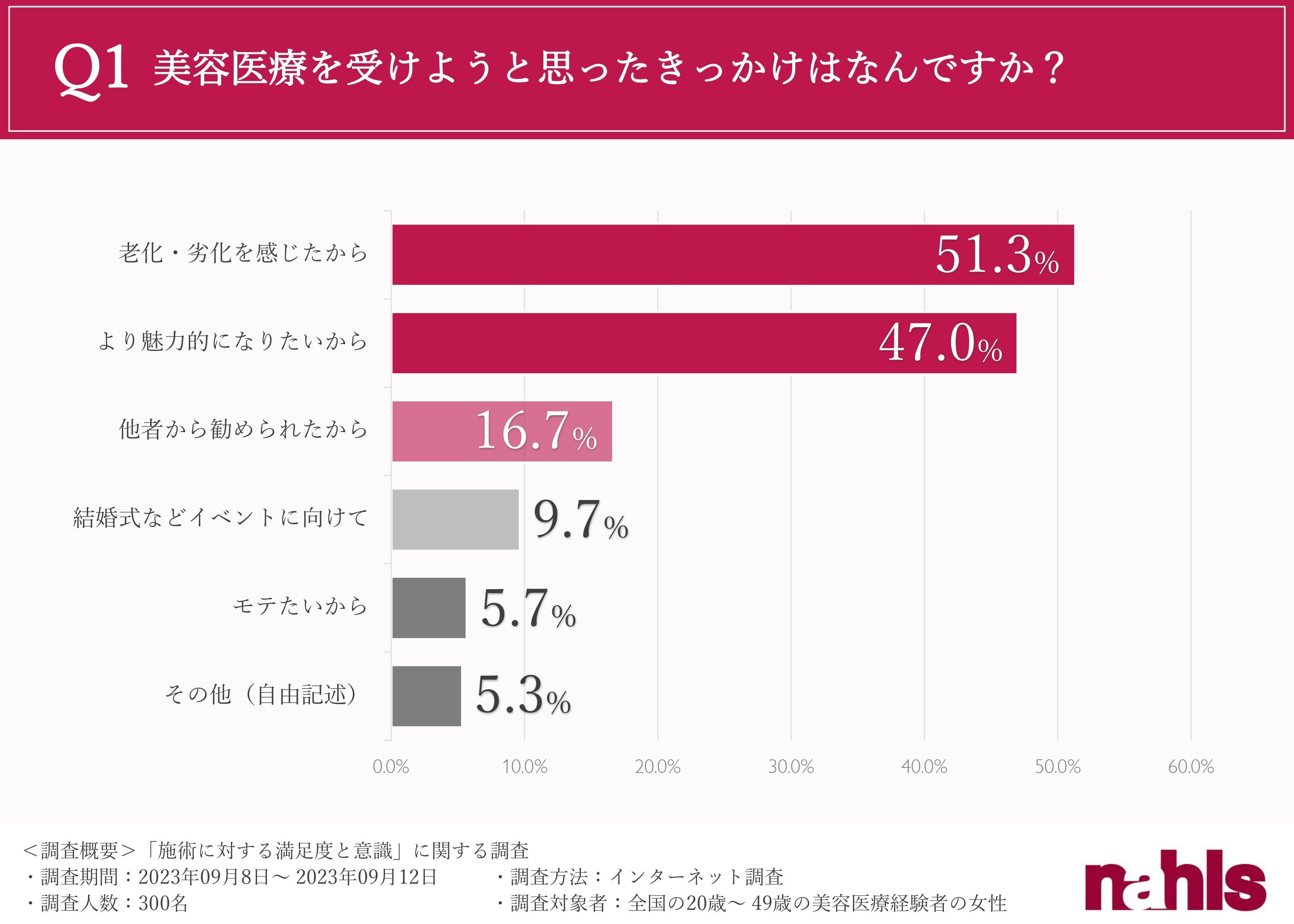 はじめに、美容医療を受けようと思ったきっかけを伺ったところ、「老化・劣化を感じたから(51.3%)」「より魅力的になりたいから(47.0%)」という結果となりました。