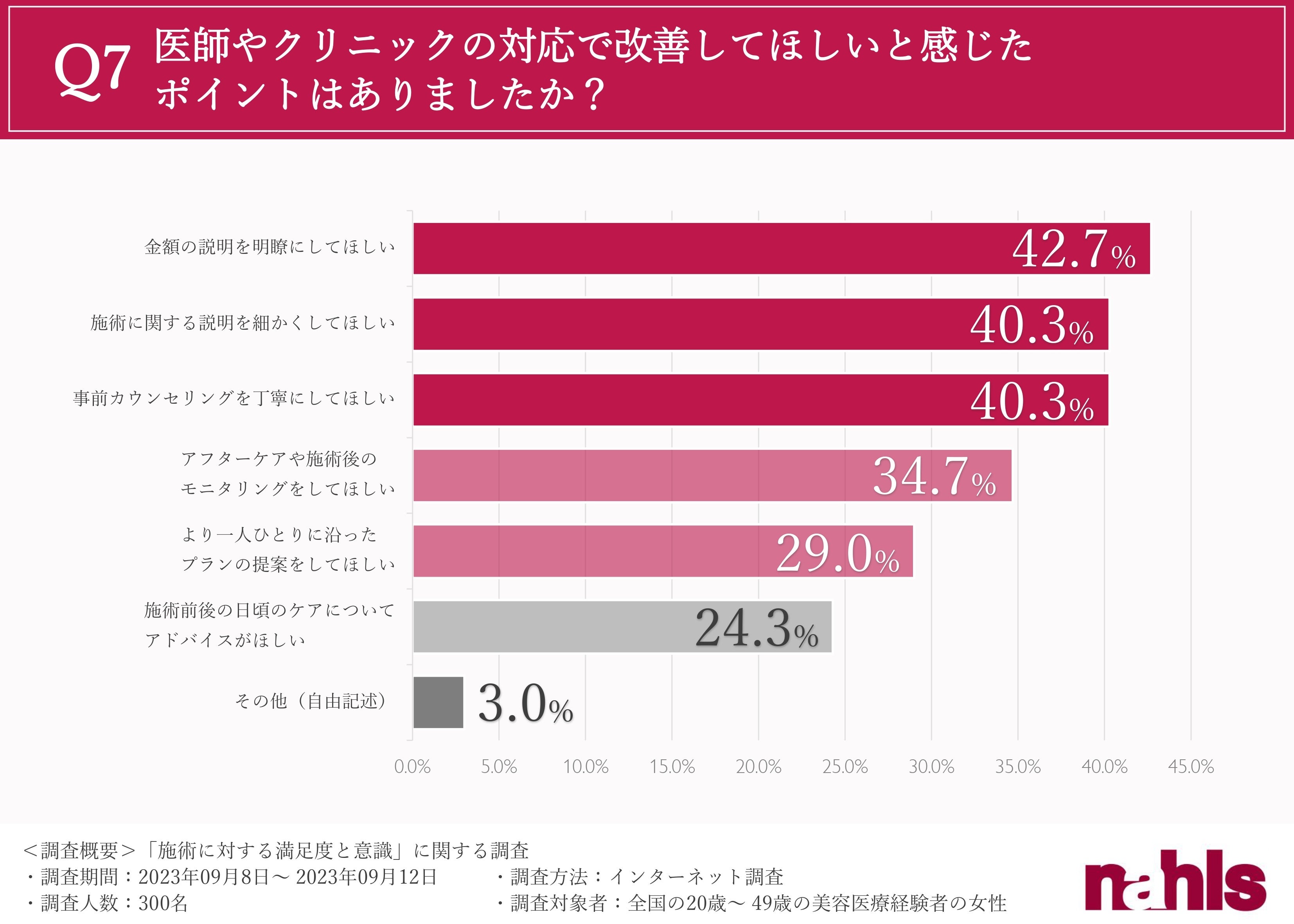 「金額の説明を明瞭にしてほしい(42.7%)」「施術に関する説明を細かくしてほしい(40.3%)」「事前カウンセリングを丁寧にしてほしい(40.3%)」という回答が多く集まる結果となりました。