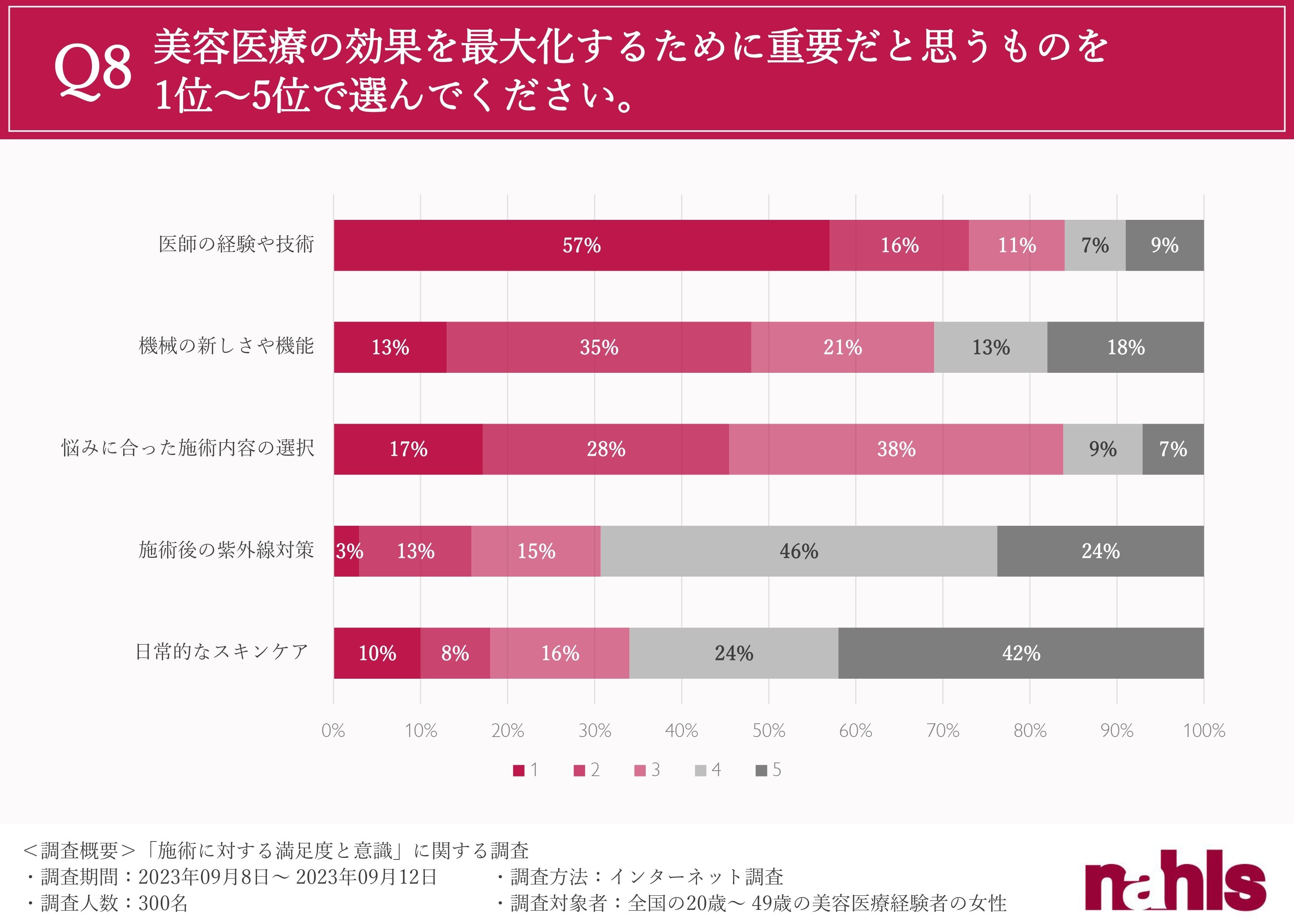 重要度が高いものから順に回答してもらった結果、美容医療において最も重要度が高い要素として、「医師の経験や技術(57%)」、「悩みに合った施術内容の選択(17%)」「機械の新しさや機能(13%)」「日常的なスキンケア(洗顔・クレンジング、保湿)(10%)」という結果となりました。