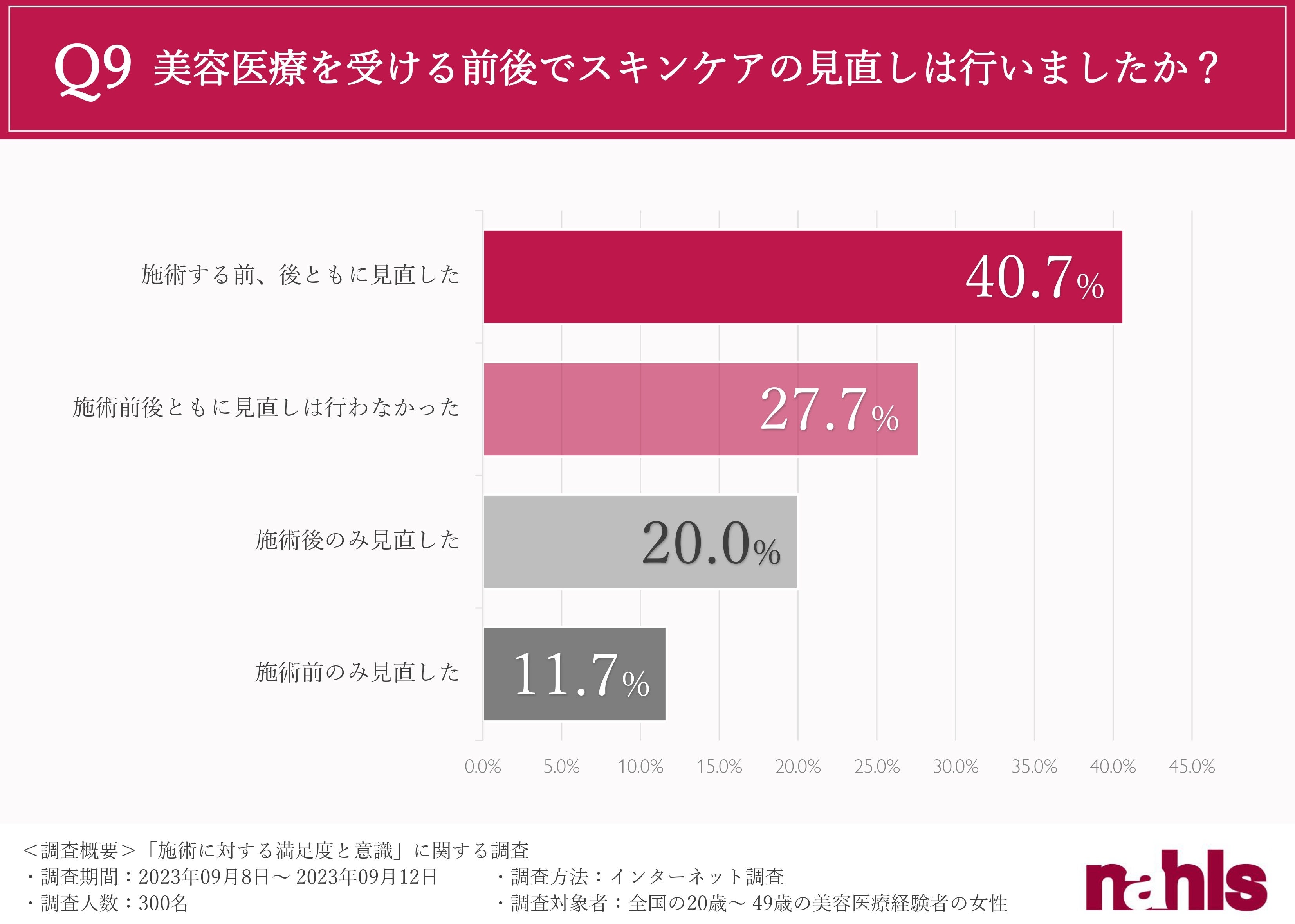 次に、美容医療を受ける前後でスキンケアの見直しを行ったかどうかについて伺ったところ、40.7%の方が「施術する前、後ともに見直した」と回答しました。