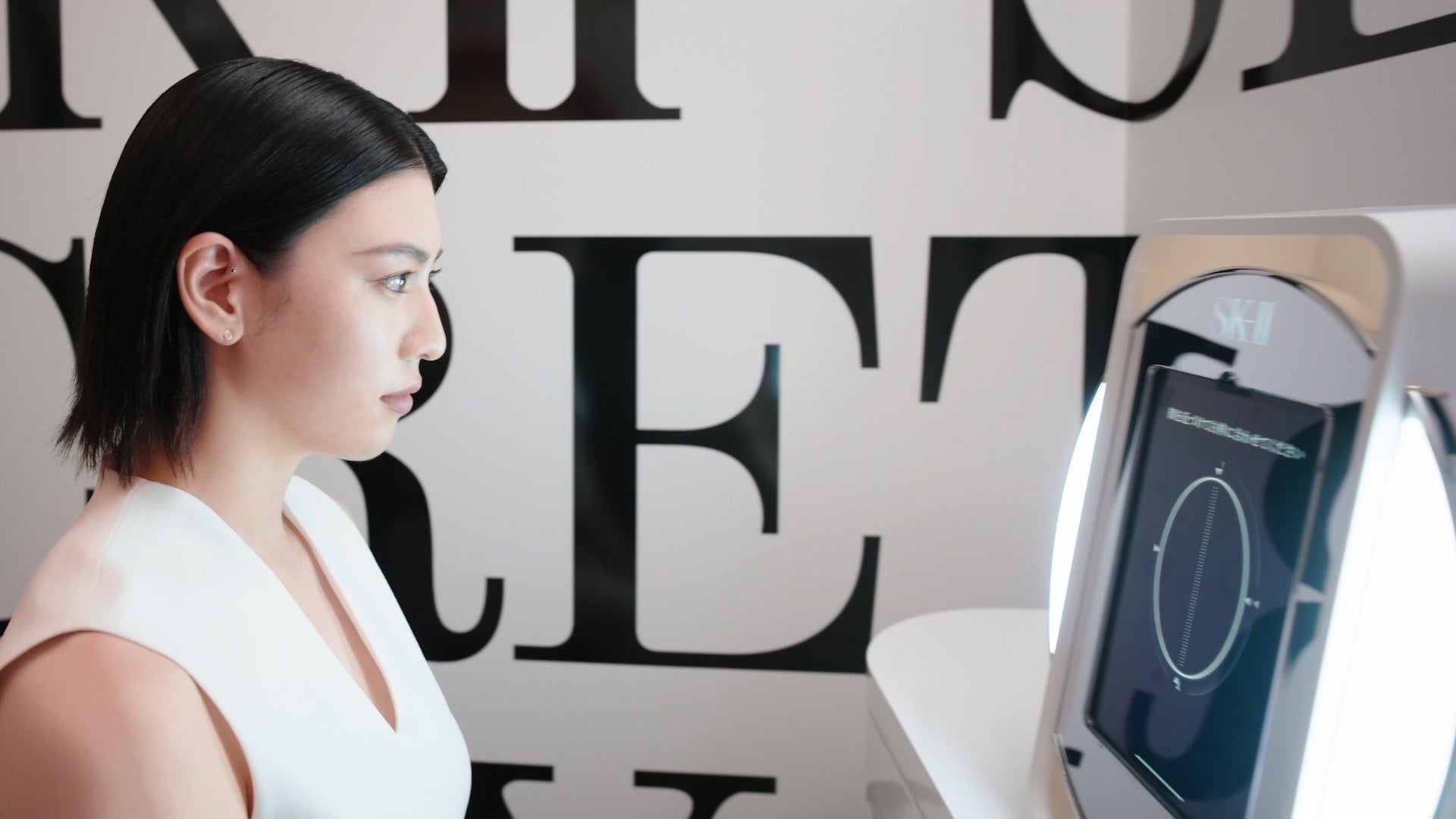「マジックスキャン」は非接触型の肌測定器で、メイクの上からでもわずか3分で肌測定ができます。全国のSK-II カウンターで、長い期間蓄積した日本人女性約120万人以上の肌測定結果のビックデータ解析から、製品を適切な使用量でお使いいただき、定期的に来店して肌測定をしている人ほど、肌の見た目がよりよくなることがわかりました。20年以上にわたり開発し続けた独自の画像解析技術およびアルゴリズムを用い、「マジックスキャン」は、生年月や肌悩み、普段お使いのスキンケアアイテムを登録後、カメラで撮影するだけで肌表面だけでなく、肌の奥の詳細な状態までを瞬時にとらえます。「肌年齢」に加え、肌のなめらかで濁りのない部分を「キラキラポイント」として表示し、ご自身のお肌の中の状態が良い部分と、さらに重点的なケアをおすすめする部分をお示ししながら適切なスキンケアのアドバイスをします。また、SK-IIのビッグデータを基に予測した、適切なお手入れ及び健康的なライフスタイルがもたらす未来の美肌も画面上で表示。さらにビューティインフルエンサーが、お客様の測定結果に応じたおすすめの製品やスキンケアのアドバイスをいたします。