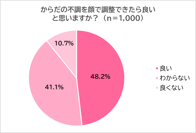 続いて、「からだの不調を顔で調整できたら良いと思うか?」と尋ねたところ、半数近く(48.2%)が「良い」と回答し、「良くない」は僅か1割(10.7%)でした。これにより、顔の反射区を押すことでからだの不調を調整できたら良いと思っている人が多いこともわかりました。
