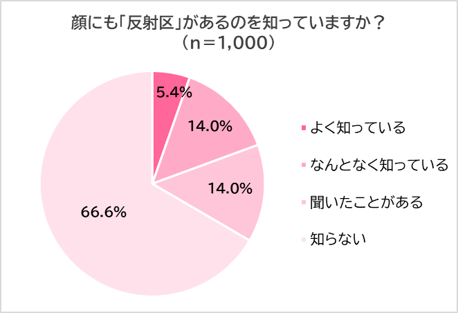 今度は、全員に「顔にも『反射区』があるのを知っているか?」尋ねました。約7割(66.6%)が「知らない」と回答しましたが、「良く知っている」(5.4%)、「なんとなく知っている」(14.0%)という人も2割いました。