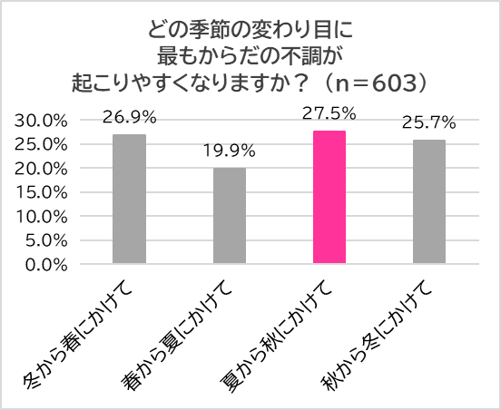 この時期特有の症状が現れている603人に「どの季節の変わり目に最も体の不調が起こりやすくなるか?」尋ねました。僅差だったものの「夏から秋にかけて」(27.5%)が最多で、以下「冬から春にかけて」(26.9%)、「秋から冬にかけて」(25.7%)、「春から夏にかけて」(19.9%)となりました。