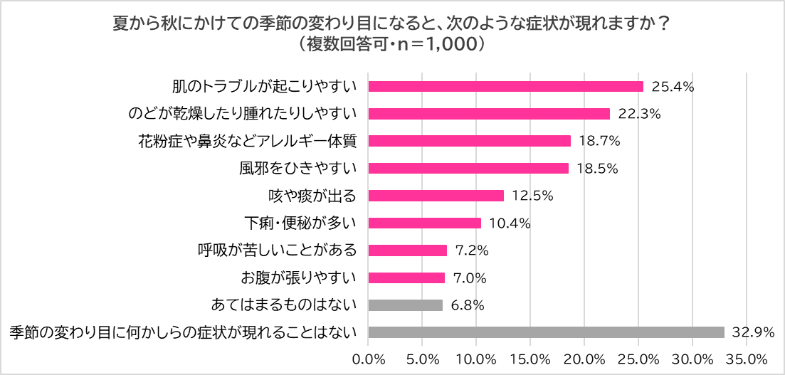 「夏から秋にかけての季節の変わり目になると、次のような症状が現れるか?」尋ねたところ、7割弱(67.1%)の人に何かしらの症状が現れていること、6割(60.3%トラブル)の人に「肌のトラブルが起こりやすい」(25.4%)、「のどが乾燥したり腫れたりしやすい」(22.3%)、「花粉症や鼻炎などアレルギー体質」(18.7%)など、この時期特有の症状が現れていることがわりました。
