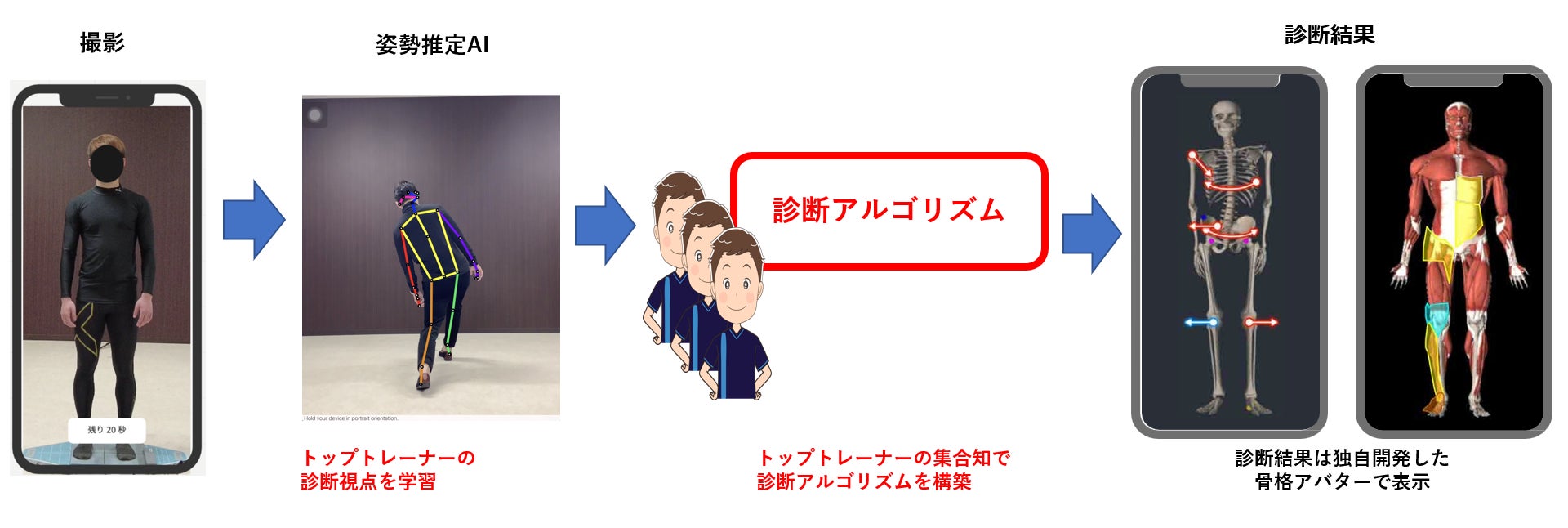 トップトレーナーの集合知を基にして学習したAIシステムで、「身体の見立て」「どこを」「どの順番で」「何のトレーニングをすべきか」の最適なトレーニングメニューを提案する「BAT(Body Analyzing Technology)システム」を開発し、人々が自分の足で生涯歩ける世界を実現します。