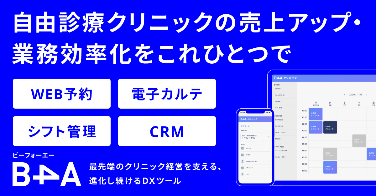 「B4A」は、リアルタイム予約や電子カルテの機能をそなえた、自由診療クリニックのDXを実現するクラウドツールです。予約~決済まで、クリニック運営に必要な機能が網羅的に備わっており、集客やリピート率向上による売上アップに加え、現場で働くスタッフの業務効率改善によるコスト削減と働き方改革を実現します。「B4A」は、日本国内の自由診療クリニック向けWeb予約システムとしては業界で唯一の特許を取得しており(2023年5月時点、特許第7271020号)、2023年8月時点で、美容クリニック、AGAクリニック、脱毛クリニック、歯科など、約200クリニックで導入・運用されています。