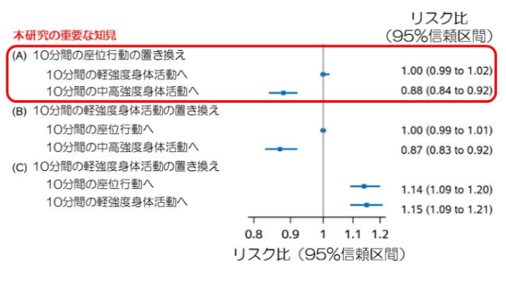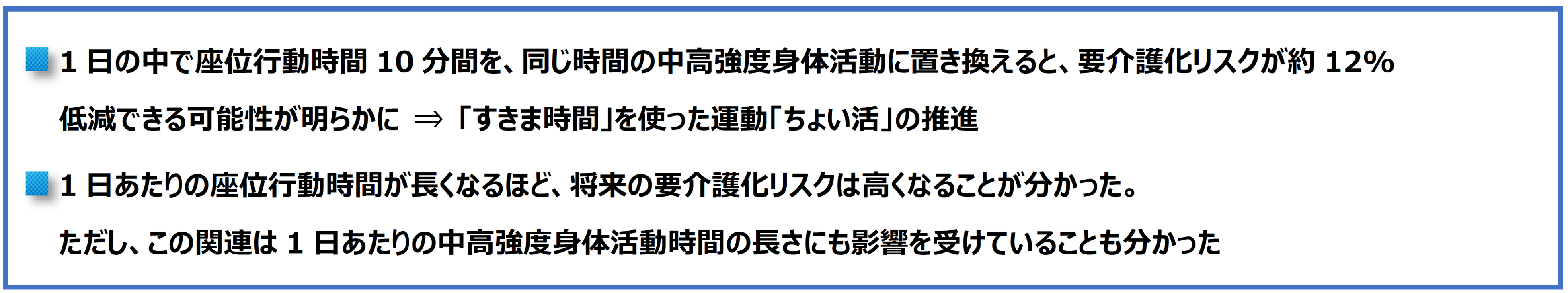 研究では2011年に篠栗町の高齢者に3軸加速度計内蔵の活動量計を装着してもらい、1週間の身体活動や座位行動を計測。その後9年間に渡って対象者を追跡して、介護保険制度における要介護・要支援認定の有無などを調査しました。これらのデータを用いて、1日あたりの座位行動時間と将来の要介護化リスクとの関連を解析したところ、統計的に有意な関連が認められました。しかし、1日あたりの中高強度身体活動時間を調整因子として解析に加えると、関連は有意ではなくなり、この関連が1日あたりの座位行動時間の長さだけではなく、中高強度身体活動時間の長さにも影響を受けることが分かりました。また、本研究では座位行動を身体活動に置き換えた場合に、要介護化リスクを低減する効果が認められるかどうかを解析しました。その結果、1日あたりの座位行動時間を10分間、同じ時間の中高強度身体活動(例えばジョギングや階段上り)に置き換えると、要介護化リスクが約12%低減できる可能性があることが分かりました。(軽強度身体活動との置き換えではこの結果は得られず、置き換えるべき身体活動は中強度以上であるべきことも分かりました。)
