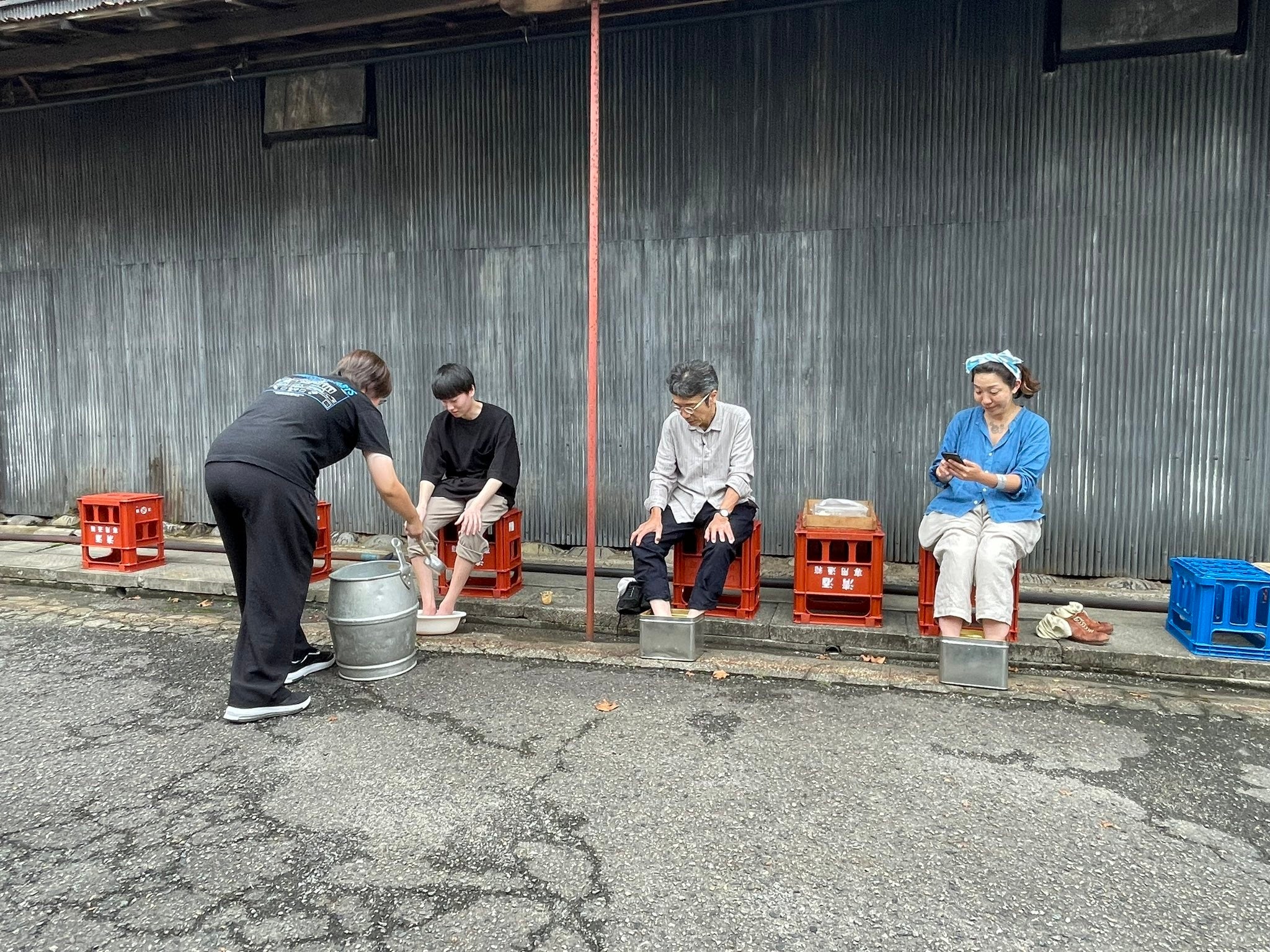 普段入ることのできない、製造を実際にしている酒蔵に囲まれて足湯することができます。