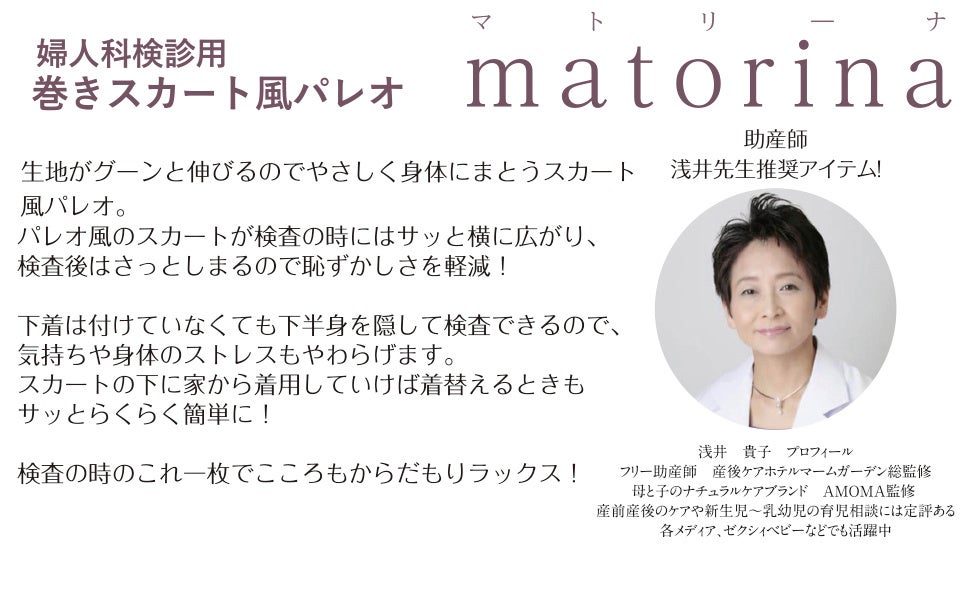 多くの出産に立ち会い女性の気持ちに寄り添う助産師浅井先生に、検査時に着用することで気持ちと身体の緊張を緩和できるアイテムとして『matorina(マトリーナ)』を推奨頂きました。
