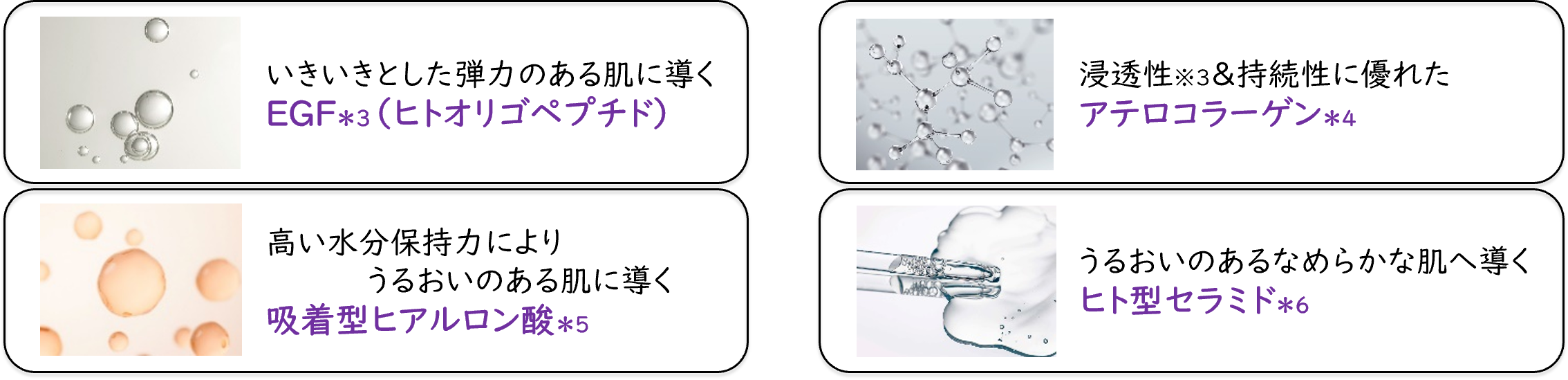 *3 ハリ成分 ヒト遺伝子組換オリゴペプチド-1 *4 保湿成分 *5 保湿成分 ヒアルロン酸ヒドロキシプロピルトリモニウム *6 保湿成分 セラミドAP、セラミドNP ※1 うるおいを与えて、乾燥によるくすみを防ぐ ※2 白玉のようなキメが整ったツヤのある肌のこと ※3 角質層まで ※4 当社従来品比