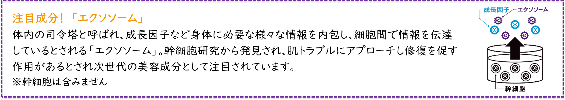 *1 整肌成分 ヒト脂肪由来間葉系細胞エクソソーム ※1 年齢に応じて肌へうるおいと弾力を与えるケアのこと
