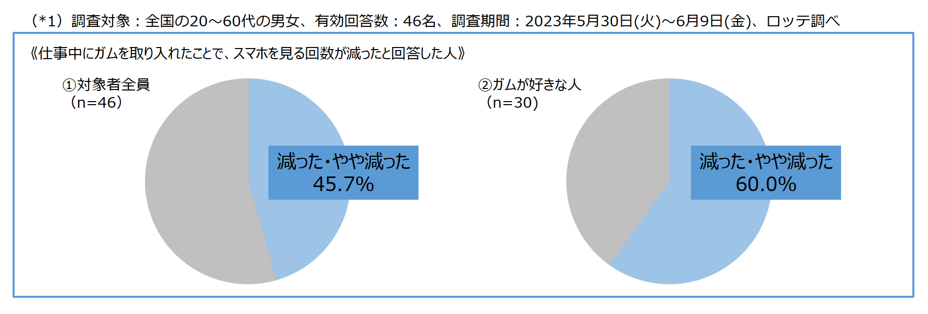 仕事や勉強に集中するためにガムを噛むという方がいらっしゃいます。実は、ガムを噛むことによる集中力向上は研究データでも示されています。デスクワークや作業中の集中力を高めることで、スマホの誘惑を断ち切り、目的もないのになんとなく気になって触ってしまうスマホ時間を減らすことができると考えています。仕事中にガムを取り入れていただいたところ、45.7%の方が仕事中についついスマホをさわってしまう回数が減ったと回答しています。ガムがもともと好きだったという方に限定すれば60.0%の人が、スマホをさわる回数が減ったと回答しています(*1)(下記グラフ参照)。