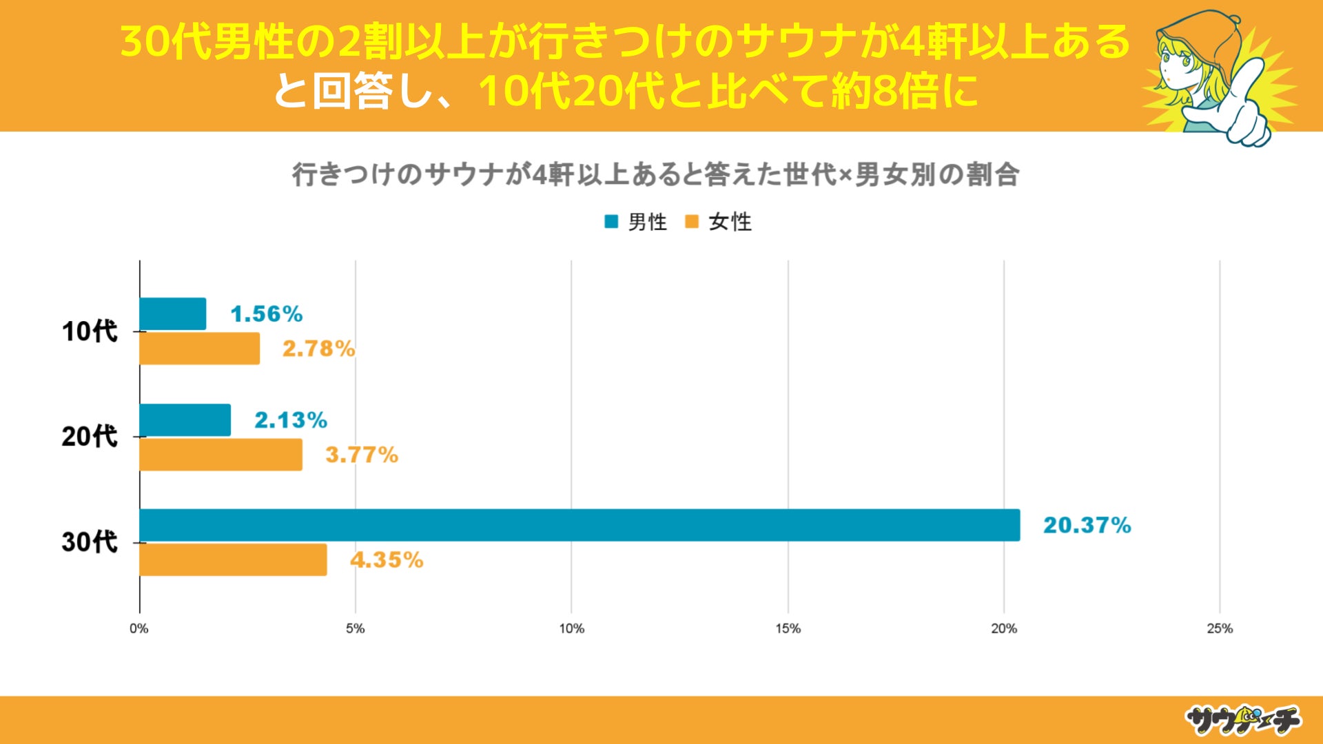 【30代男性の2割以上が行きつけのサウナが4軒以上あると回答し、10代20代と比べて約8倍に】