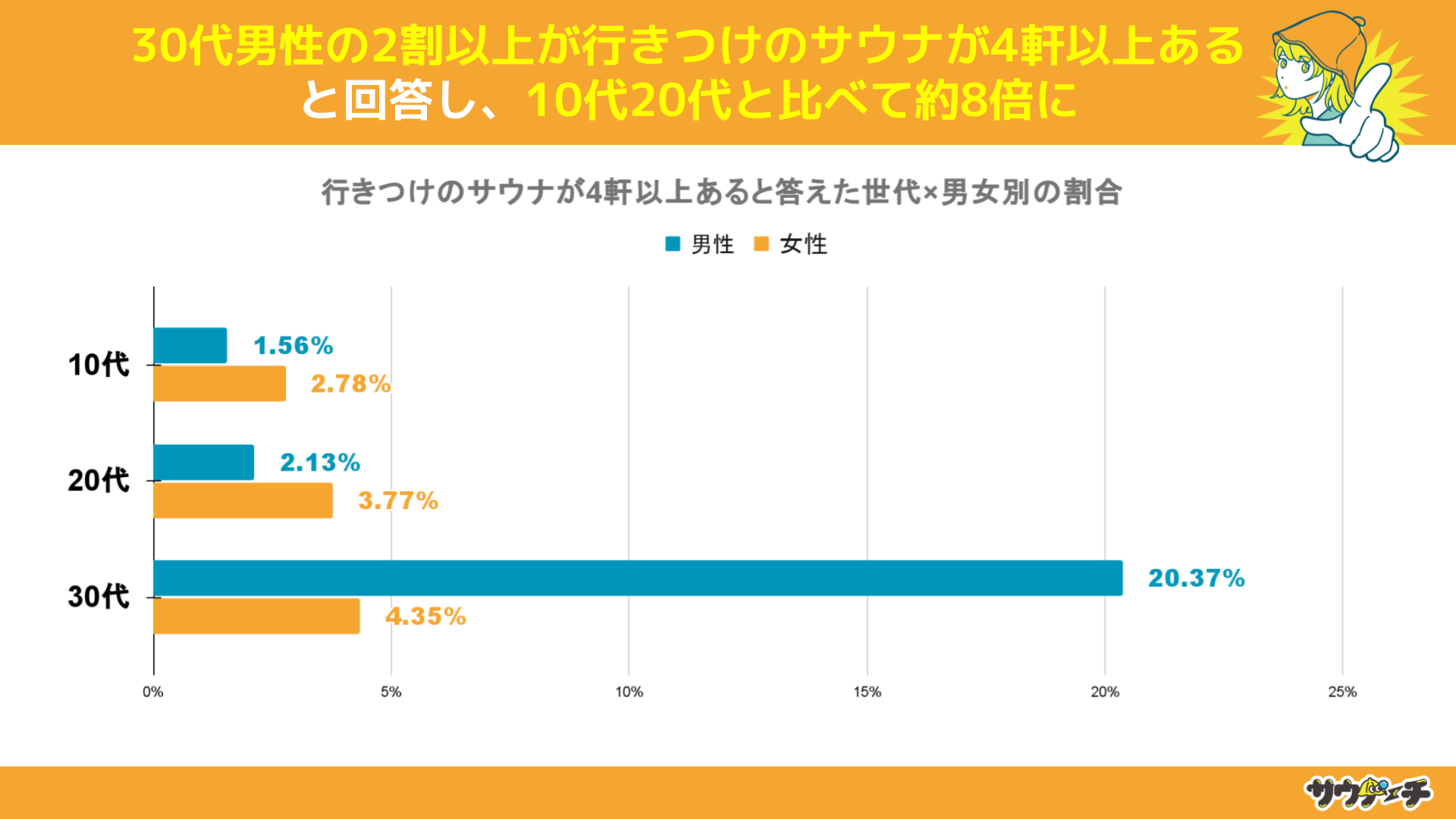 行きつけのサウナが4軒以上あると回答したと割合を世代×男女別でみてみますと、30代男性の20.37%が最も高く、次いで30代女性の4.35%、20代女性の3.77%と、世代が上がる毎に割合が高くなり、10代20代より30代男性の方が約8倍高い結果となりました。