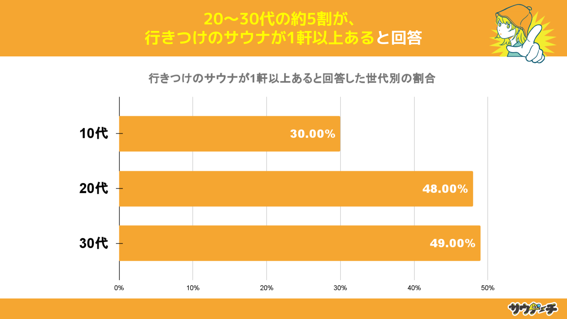 行きつけのサウナが1軒以上あると回答したと割合を世代別でみてみますと、30代の49%が最も高く、次いで20代の48%、10代の30%と、世代が上がる毎に割合が高くなりました。