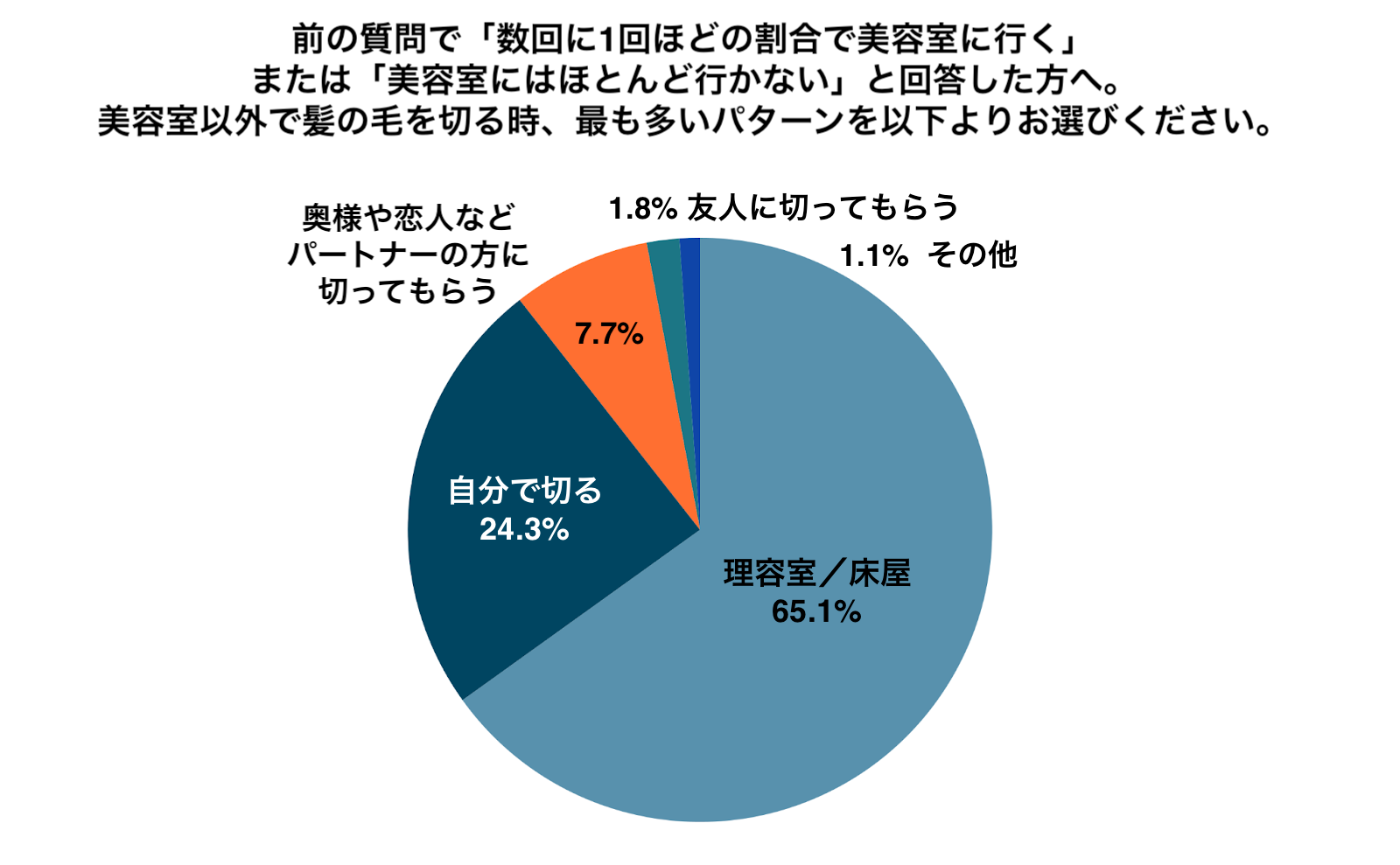 「髪の毛を切りたい時、美容室(※理容室・床屋は除きます)で切ることが多いですか?」と質問したところ、「美容室にはほとんど行かない」と回答した方が63.9%もいることがわかりました。そのうち美容室以外で髪を切る際の最も多いパターンとして「自分で切る」と回答したのは24.3%で、全体で約5人に1人の男性が自分で髪を切っていることがわかりました。それ以外の回答として、パートナーに切ってもらう方や友人に切ってもらう方も多くいらっしゃいました。