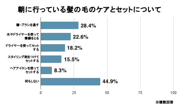 「朝に行なっている髪の毛のケアとセットに当てはまるものをお選びください」と質問したところ、「何もしない」と回答した方が44.9%で約半数の方が朝は何もしていないことがわかりました。櫛・ブラシを通したり寝癖をとったりするという方は2割〜3割程度である一方、ヘアセットを行なっている方は2割以下と少数の回答でした。