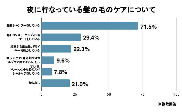 「夜に行なっている髪の毛のケアに当てはまるものをお選びください」と質問したところ、「毎日シャンプーをしている」と回答した方が71.5%である一方、その他のケアに関してはいずれも30%以下の回答となりました。頭皮や髪のトラブルを防ぐためには髪の毛をドライヤーでしっかりと乾かすことが有効ですが、「浴室から出た後、ドライヤーで乾かしている」と回答した方は2割程度であることがわかりました。