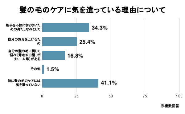 「髪の毛のケアに気を遣っている理由」を質問したところ、「相手を不快にさせないための身だしなみとして」と回答した方が34.3%と最も多い結果となりました。櫛・ブラシを通したり寝癖をとったりすることで身だしなみを整えている方が多いことがわかります。