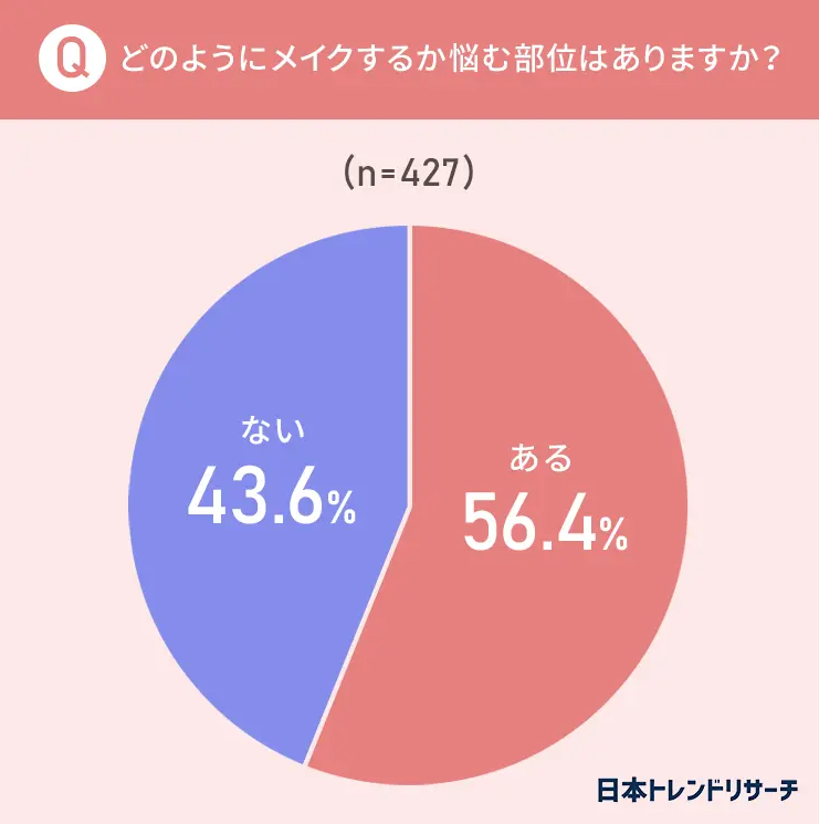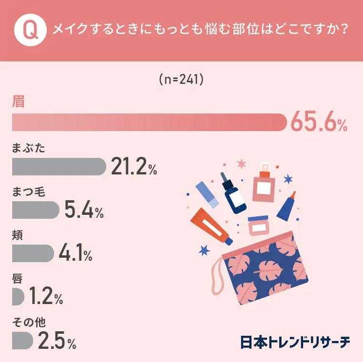 また、普段メイクをしている女性に対するアンケートでは56.4%と半数以上が「悩む部位がある」と回答し、もっとも悩む部位については65.6%が「眉」だと回答しています。(「日本トレンドリサーチとamyによる調査」による。https://trend-research.jp/15549/ https://amy-beauty.net/