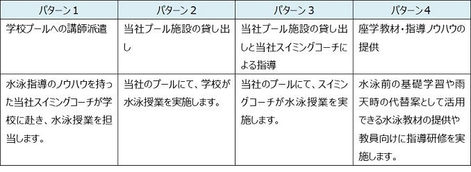 学校の課題やご要望に応じて、主に4つのパターンで水泳授業を支援しています。