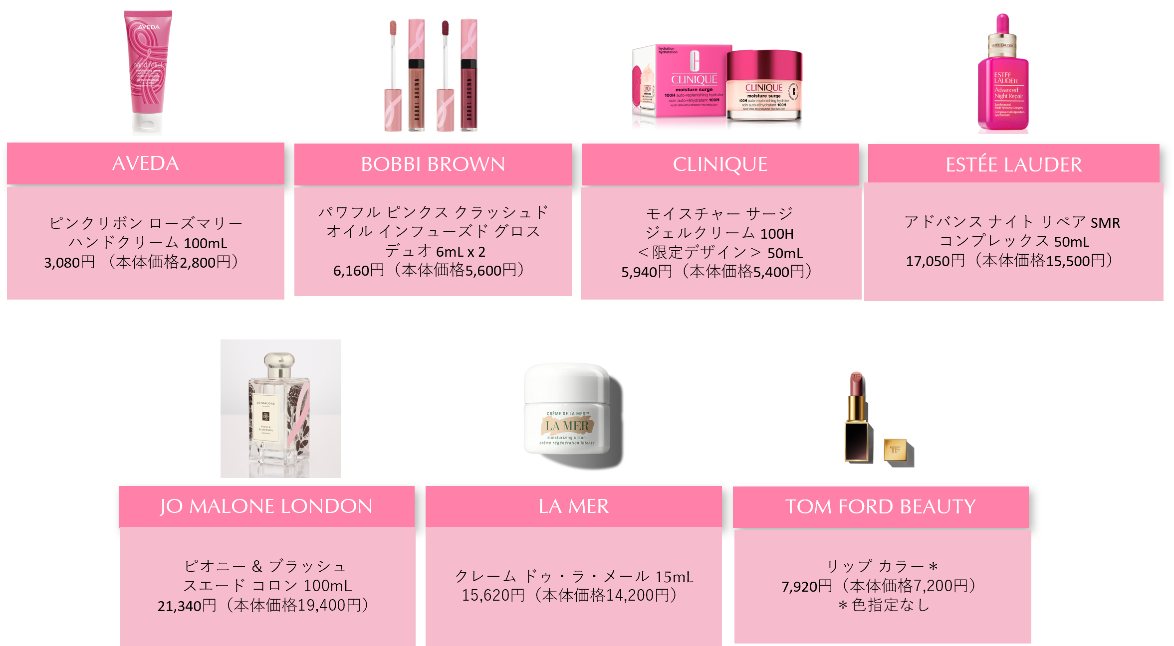 「乳がんキャンペーン」 が始まる10月1日(日)より、エスティ ローダー カンパニーズ 7ブランド(アヴェダ 、エスティ ローダー 、クリニーク、ジョー マローン ロンドン、ラ・メール、トム フォード ビューティ、ボビイ ブラウン)にてキャンペーン支援製品の販売を開始します。収益の一部は、米国乳がん研究基金(BCRF)やJBCRG (Japan Breast Cancer Research Group) 等を通して医療研究に役立てられます。