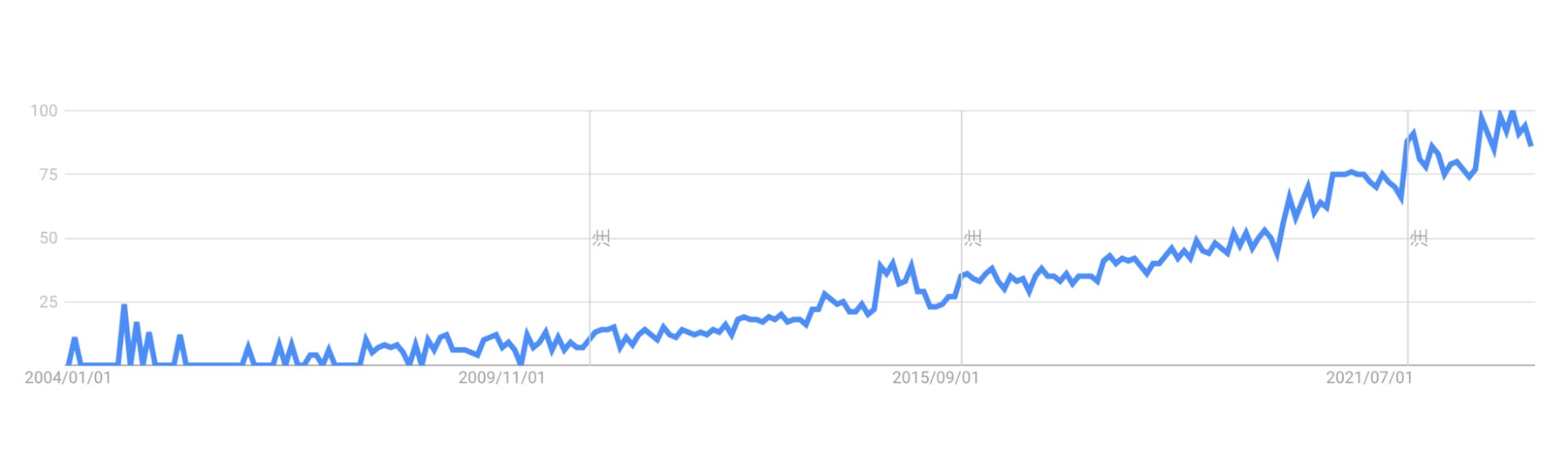 厚生労働省による患者調査による歯科矯正初診患者数は、2019年から2022年の3年間で3.6倍に増加(※1)しています。さらに歯科矯正の中でも、「マウスピース矯正」という単語のGoogle検索数は2004年頃と比較して8-9倍程に伸びています。