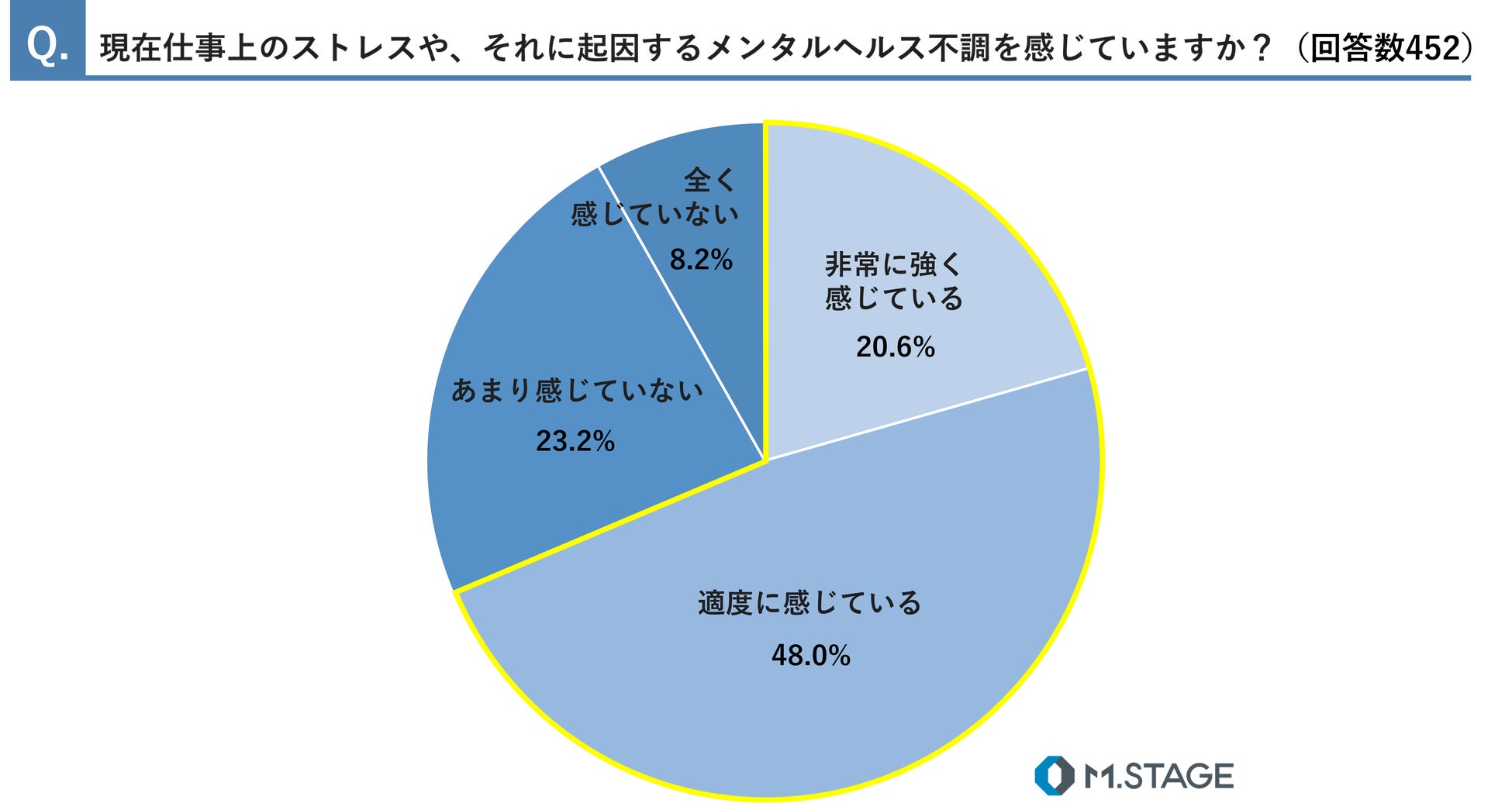 仕事上のストレスや、それに起因するメンタヘルス不調に関して、20.6%が「非常に強く感じている」、48.0%が「適度に感じている」と回答。68.6%の医師が仕事上のストレスを感じている結果となりました。