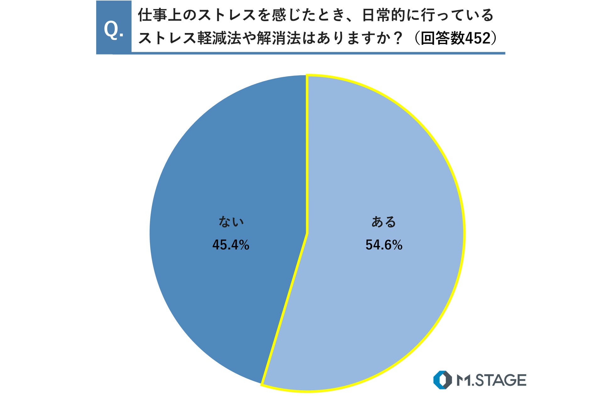 仕事上のストレスを感じたとき、日常的に行っているストレス軽減法や解消法が「ある」と回答した医師は54.6%になり、半数以上が自身のストレスへの対処法を持っている結果となりました。