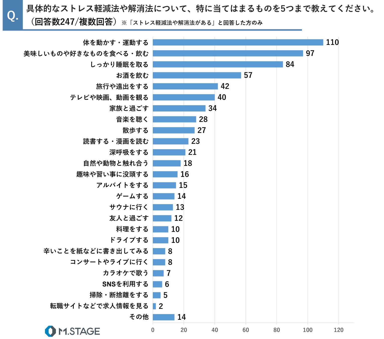 また、具体的な対処法は「体を動かす・運動する」(110)が最も多く、「美味しいものや好きなものを食べる・飲む」(97)、「しっかり睡眠をとる」(84)が続く結果となりました。