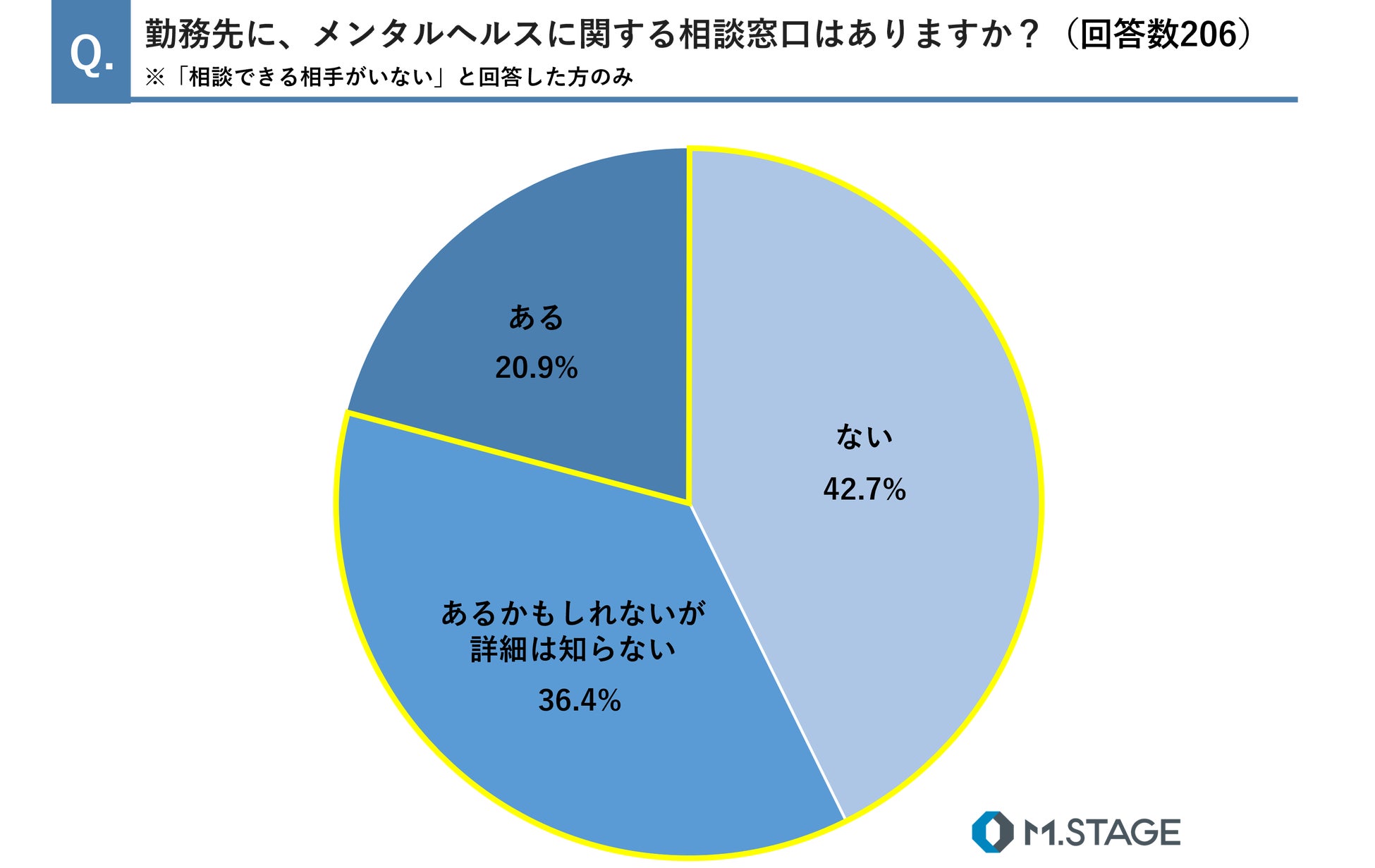 反対に20.9%は「ある」と回答し、勤務先に相談先があるにも関わらず、相談相手が「いない」と感じている結果となりました。
