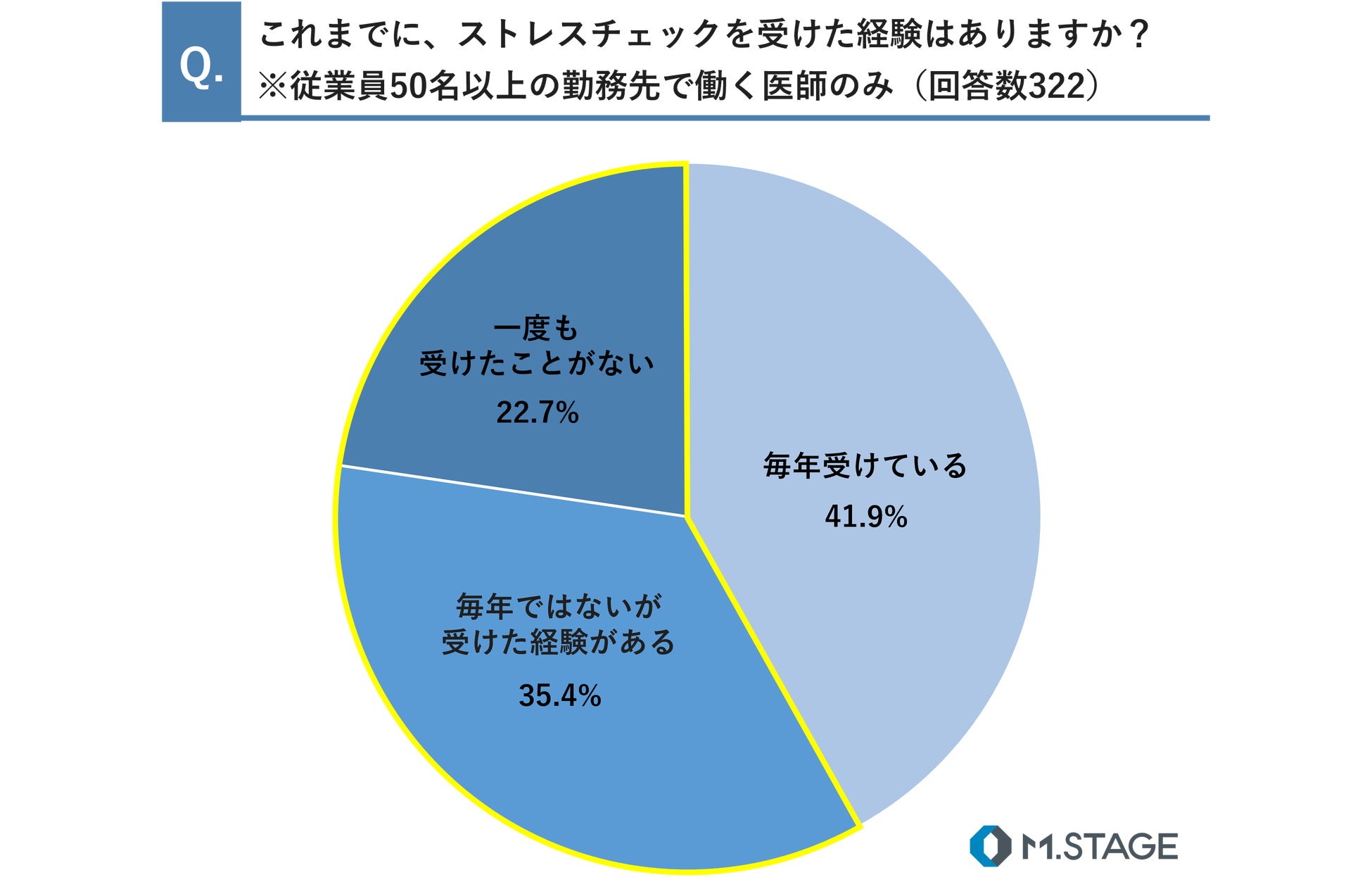 労働者のストレスの程度を把握し、労働者自身のストレスへの気づきを促すとともに職場環境改善につなげることを目的とした「ストレスチェック制度」は、常時50人以上の従業員を雇用する事業場の場合、年1回以上実施することが労働安全衛生法で義務付けられています。このストレスチェックについて、従業員50名以上の勤務先で「毎年受けている」医師は41.9%、「毎年ではないが受けた経験がある」医師が35.4%、「一度も受けたことがない」医師が22.7%となり、5人に1人の医師はストレスチェックを一度も受けた経験がない結果となりました。また、年1回以上実施するべきストレスチェックを受けることができている医師は、約4割に留まることがわかりました。