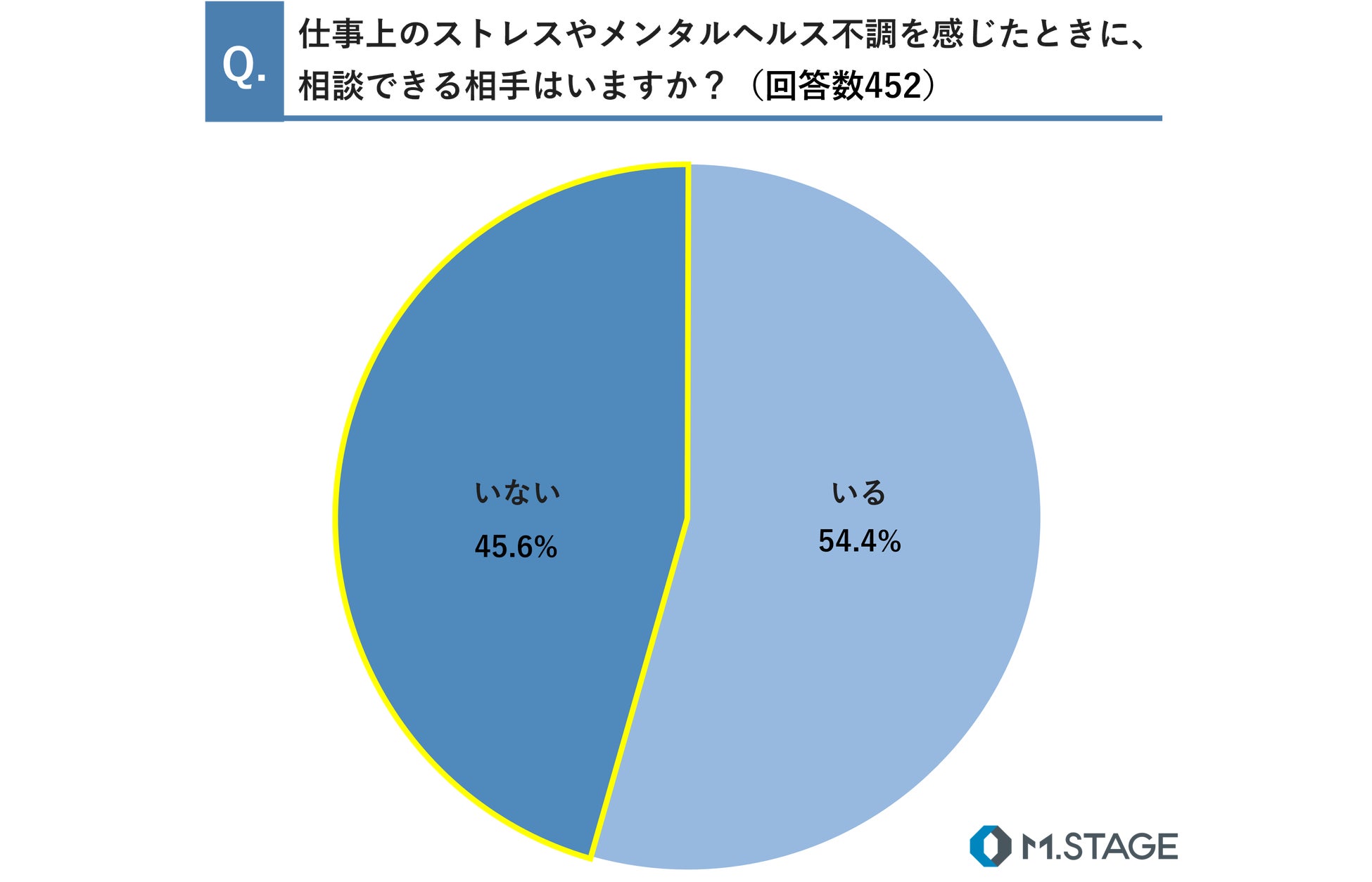 仕事上のストレスやメンタルヘルス不調を感じたときに、54.4%が相談相手が「いる」と回答。反対に、45.6%が「いない」と回答しました。医師の4割以上がストレスやメンタルヘルス不調の相談先がない結果となりました。