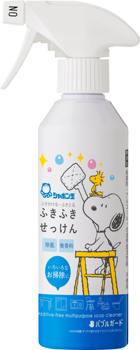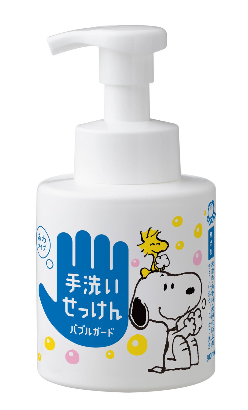 「手洗いせっけんバブルガード」「ふきふきせっけんバブルガード」「シャボン玉ベビーソープ固形タイプ」ではスヌーピーが手洗いや拭き掃除、入浴をウッドストックと仲良く行うデザインで、「自分自身、お互い、地球への思いやりを大切にする」ことを伝えています。