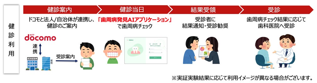しかし、歯周病検診の受診率は低く、歯周病の罹患率の高さに対する改善が課題となっています。この課題解決に向け、東北大学大学院歯学研究科と共同開発中の「歯周病発見AI」※2を用いて、スマートフォンやタブレットで  歯ぐきを撮影した画像から歯周病に罹患している可能性を簡易に判定する「歯周病発見AIアプリケーション」※3 (以下、本アプリケーション)を歯周病スクリーニングツールとしてドコモが実用にむけた実証を行います。