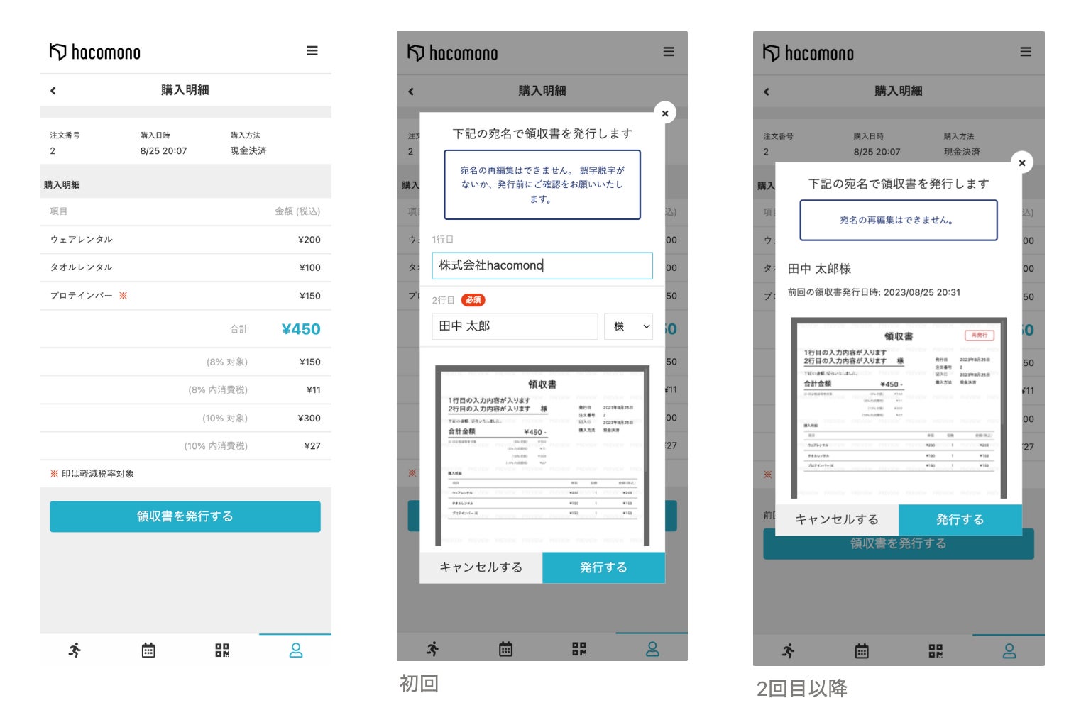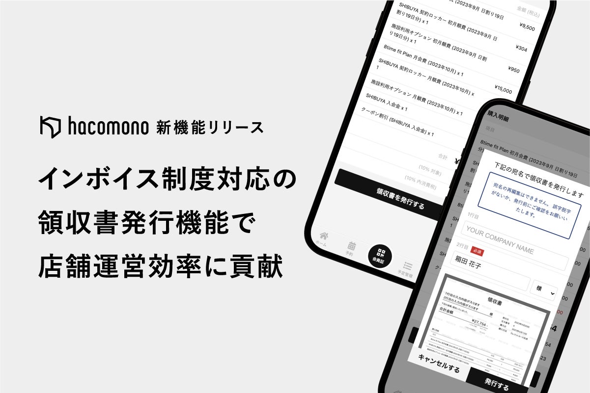 2023年10月1日より開始されるインボイス制度にともない、店舗利用者様(以下、店舗利用者)はマイページから、店舗運営事業者様(以下、事業者)は「hacomono」管理画面を通じて、インボイス制度に対応した領収書を簡単に発行することが可能となります。