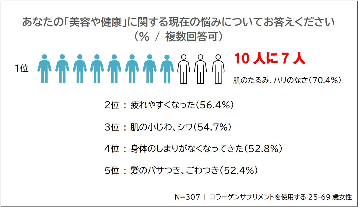■コラーゲンサプリ使用者の悩み、7割が「肌のたるみ、ハリのなさ」、5割が「疲れやすさ」