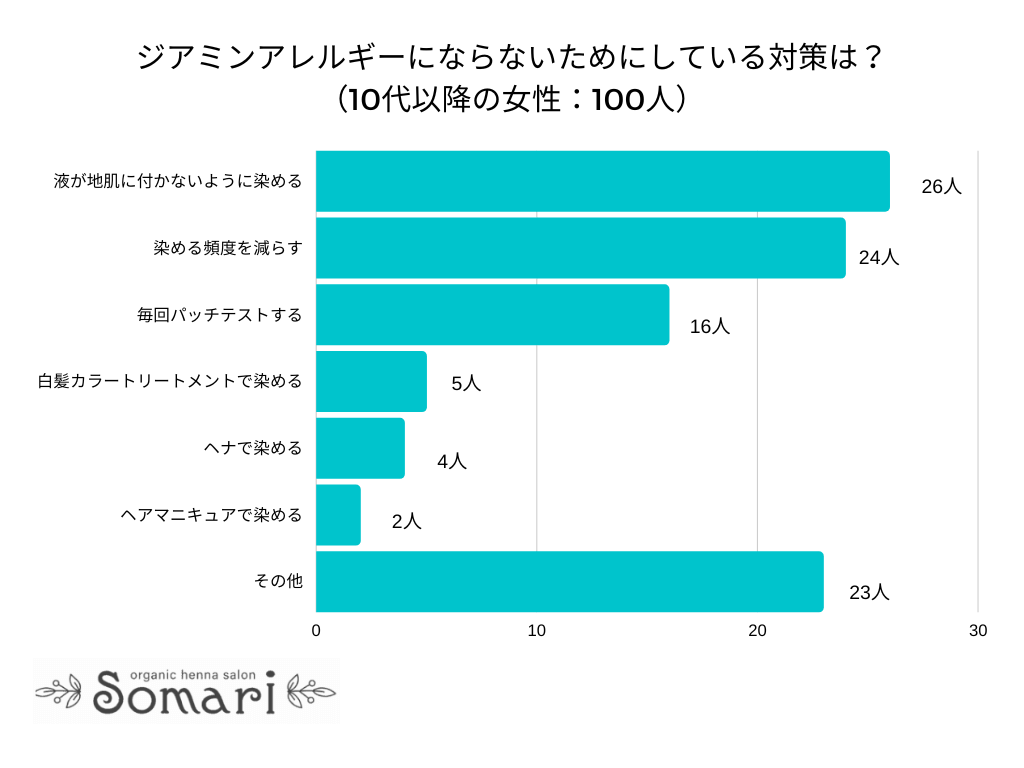株式会社AWA(https://a-w-a.co.jp/)が運営する地域密着型白髪染め専門美容室ソマリ(https://a-w-a.co.jp/hennasalonsomari/)は、日本全国の10代以上の女性を対象に「ジアミンアレルギーにならないためにしている対策は?」とアンケート調査を実施しました。