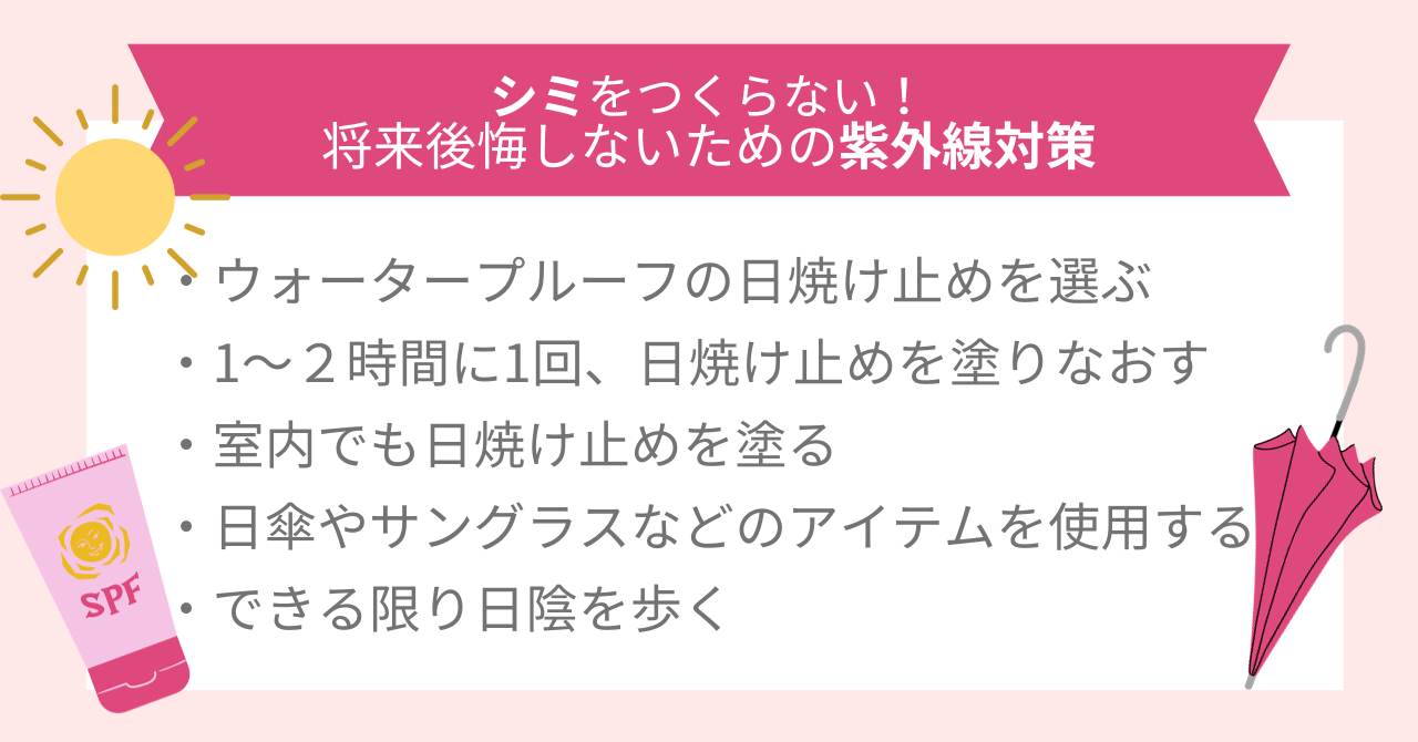 日焼け止めを塗っても、完全に紫外線をカットすることができないため、物理的に紫外線対策を行うことも、シミ予防に必須です。