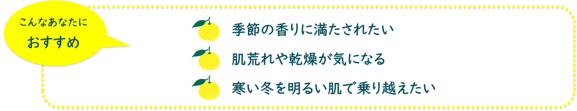 その由来は「冬至(とうじ)」と「湯治(とうじ)」、「湯治(ゆじ)」と「柚子(ゆず)」を掛けた、江戸の人々の粋な言葉遊びだったという説があります。また、ゆずの香りが「邪気」を払ってくれるとするスピリチュアルな一説も。ユーモアと豊かな知恵で、厳しい冬もごきげんに乗り切った江戸の人々にあやかって、今年の冬もルルルンな素肌に。
