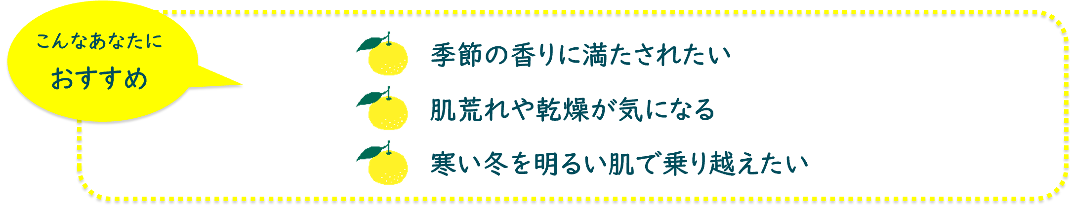 その由来は「冬至(とうじ)」と「湯治(とうじ)」、「湯治(ゆじ)」と「柚子(ゆず)」を掛けた、江戸の人々の粋な言葉遊びだったという説があります。また、ゆずの香りが「邪気」を払ってくれるとするスピリチュアルな一説も。ユーモアと豊かな知恵で、厳しい冬もごきげんに乗り切った江戸の人々にあやかって、今年の冬もルルルンな素肌に。