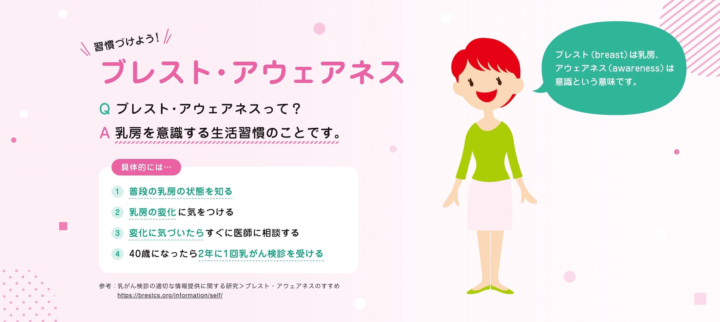 ブレスト・アウェアネスとは、ブレスト(乳房)、アウェアネス(気づき、自覚する)の2つの単語でできている言葉で、乳房を意識する生活習慣により乳がんを早期発見できるようにする取り組みです。